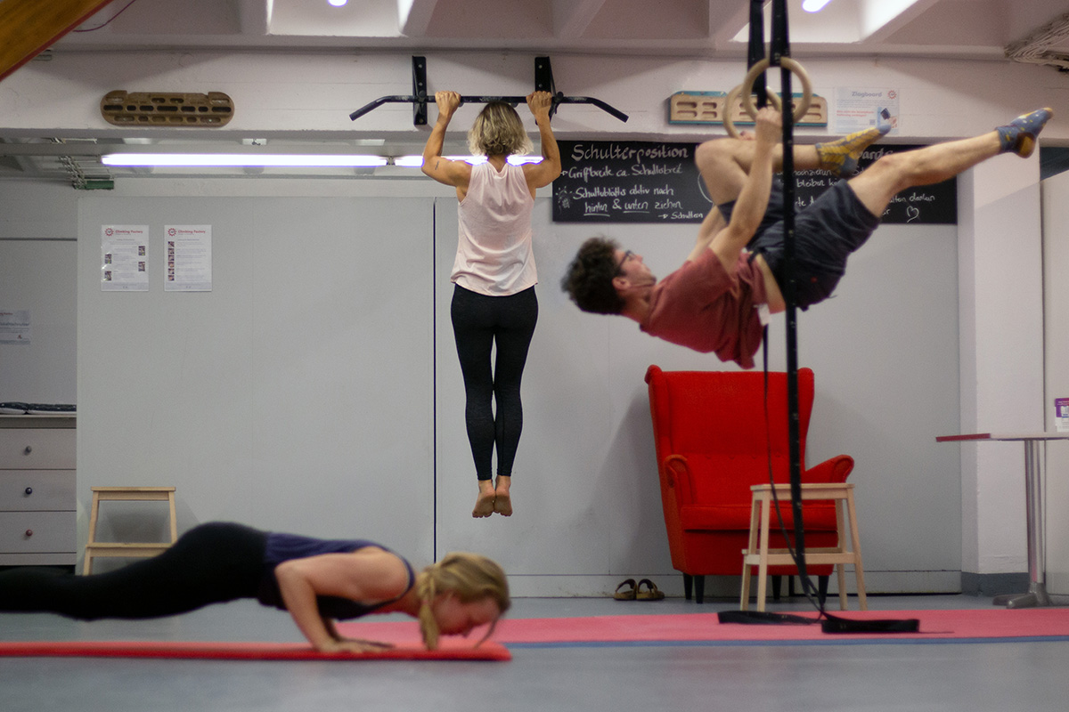 Außerdem stehen euch Ringe zur Verfügung, ein Crashpad sowie zehn Trainingsmatten für eure Auf- und Abwärmübungen.